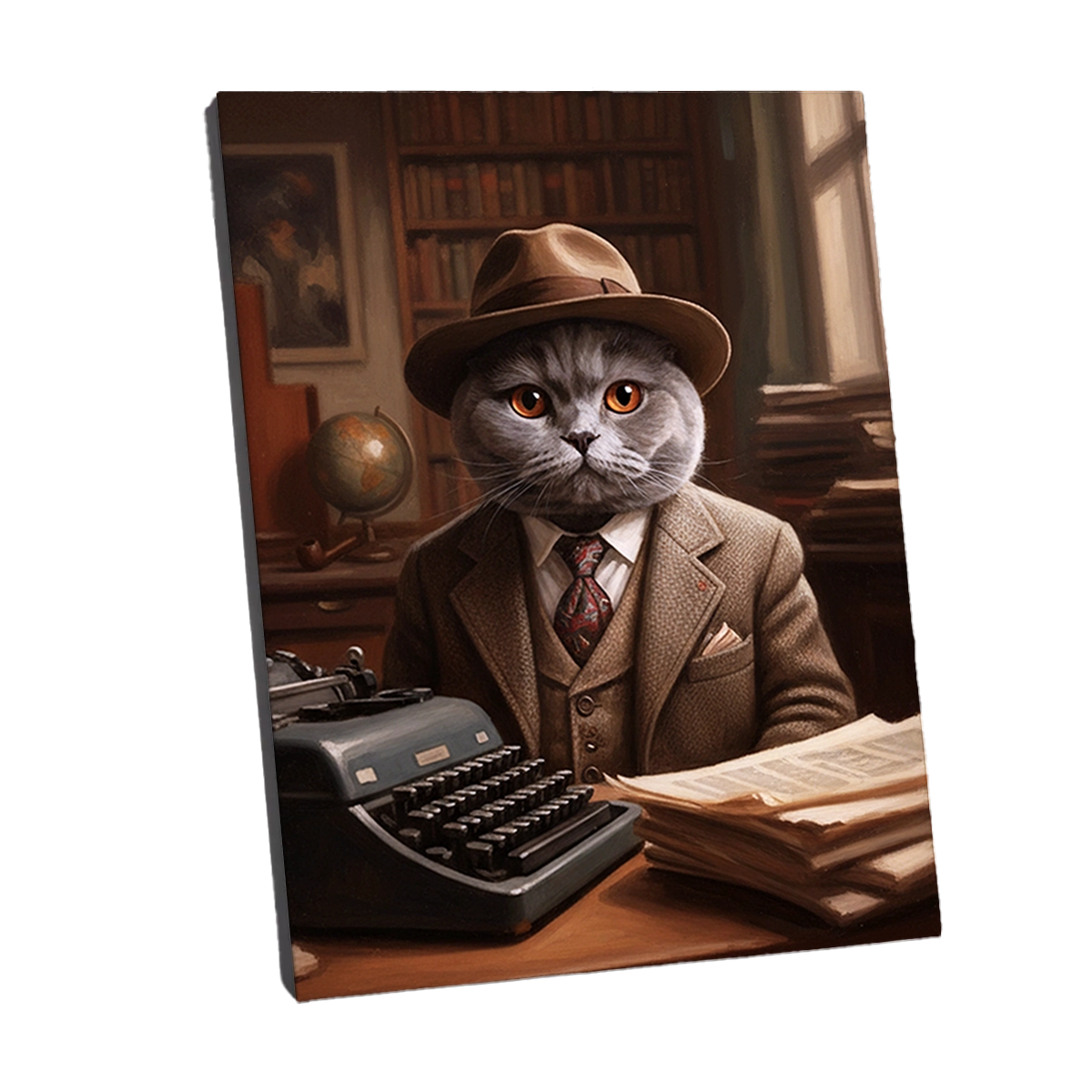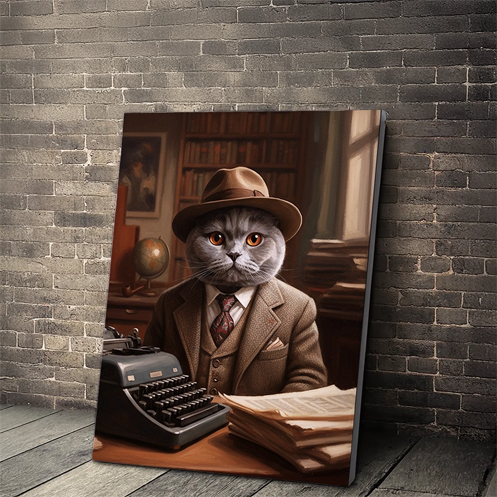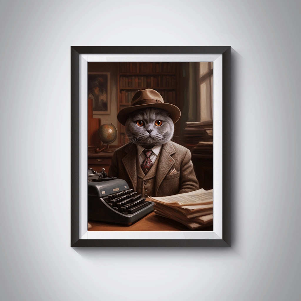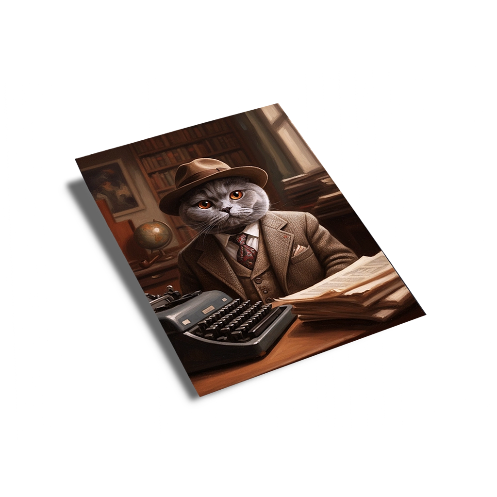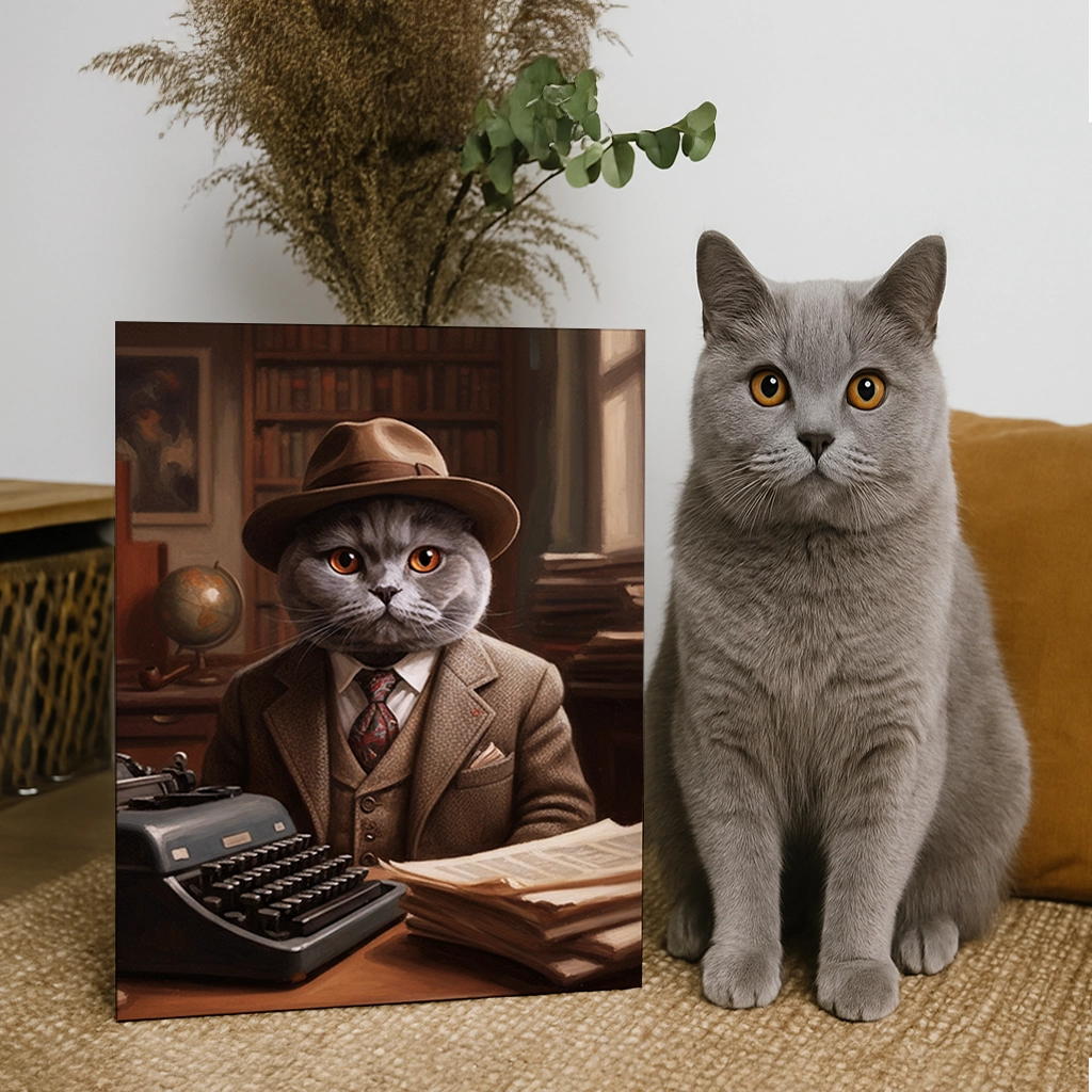 Le Portrait British Shorthair Écrivain est une œuvre d’art qui rend hommage au pouvoir des mots et au mystère. Ce tableau capture votre British Shorthair dans la peau d’un auteur de romans noirs ou d’un journaliste d’enquête des années 1930/1940. Il est vêtu d’un costume en tweed marron, d’un gilet et d’un chapeau fedora, assis devant une machine à écrire vintage. Le fond, rempli de livres, d’un globe terrestre et d’un éclairage chaud, évoque l’atmosphère studieuse et feutrée d’un bureau où se trament de grandes histoires.
