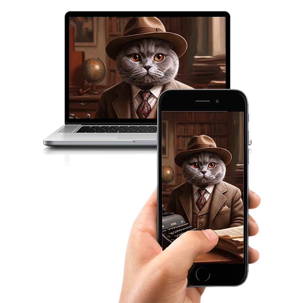 L’utilisation des tons bruns, du cuir et de la texture du tweed confère au Portrait British Shorthair Écrivain une profondeur et un réalisme incroyables. C’est un portrait qui célèbre la perspicacité et la curiosité, des qualités que vous reconnaissez chez votre propre Chat.