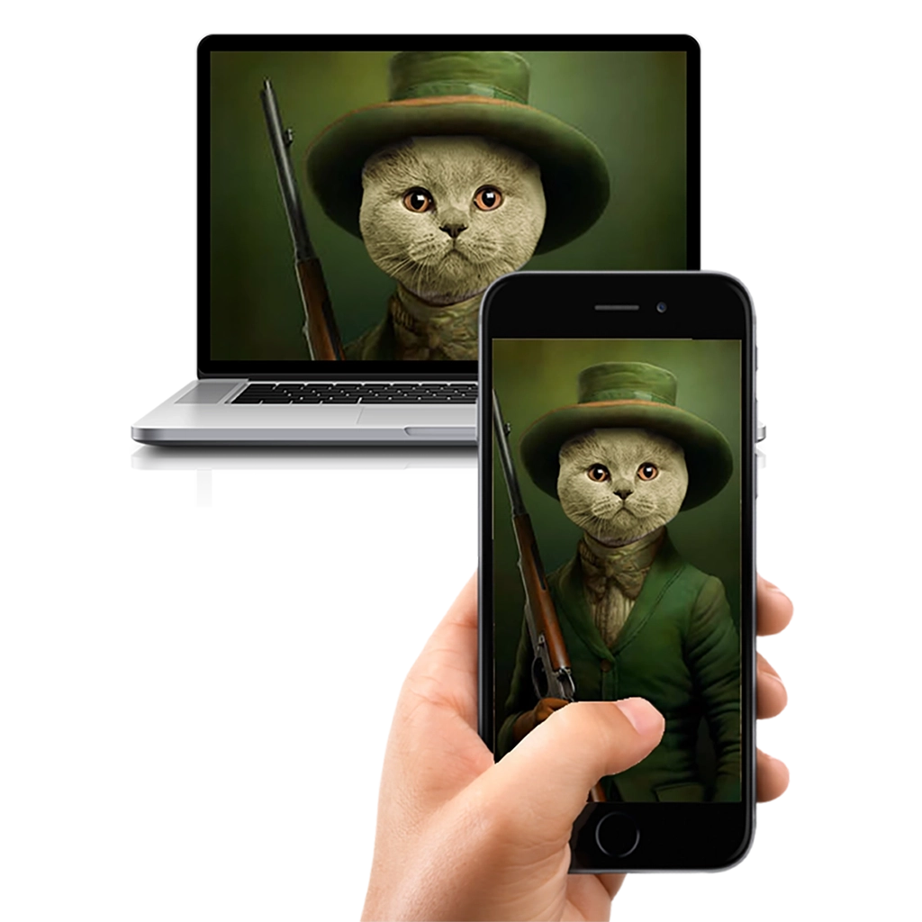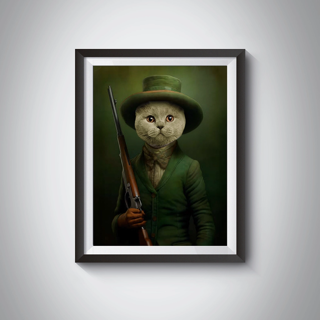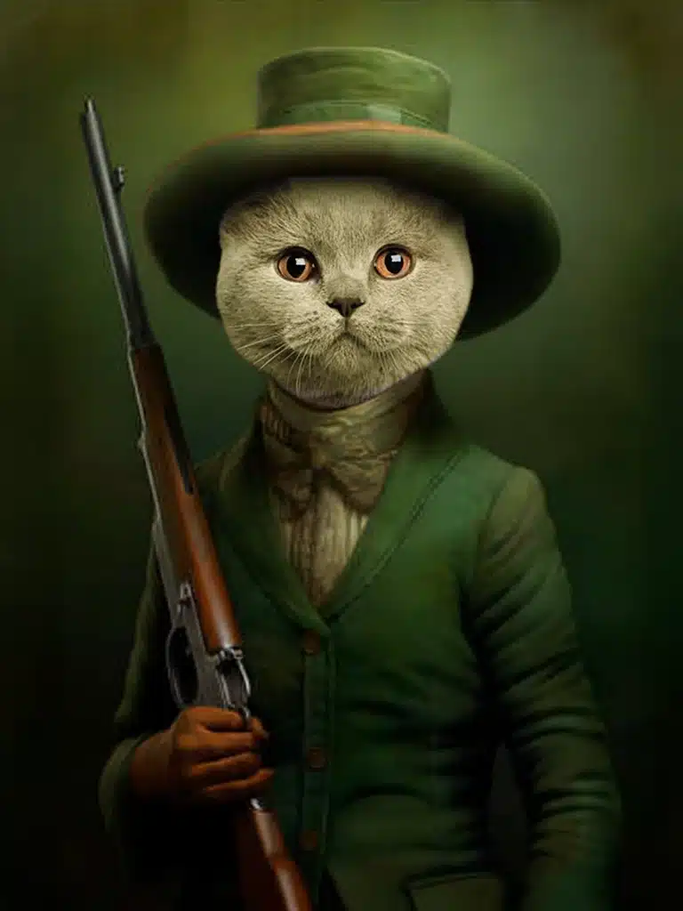 Le défi artistique du Portrait British Shorthair Chasseur est d’intégrer la tête ronde du Chat au col de la veste de manière naturelle, en utilisant la densité de sa fourrure pour masquer la jonction. L’artiste se concentre sur le regard du Chat, qui doit exprimer une détermination calme et une patience de prédateur. Le fusil, placé en diagonale, renforce la composition et le sérieux du rôle. C’est un portrait qui demande une grande précision pour que l’élégance soit parfaite.