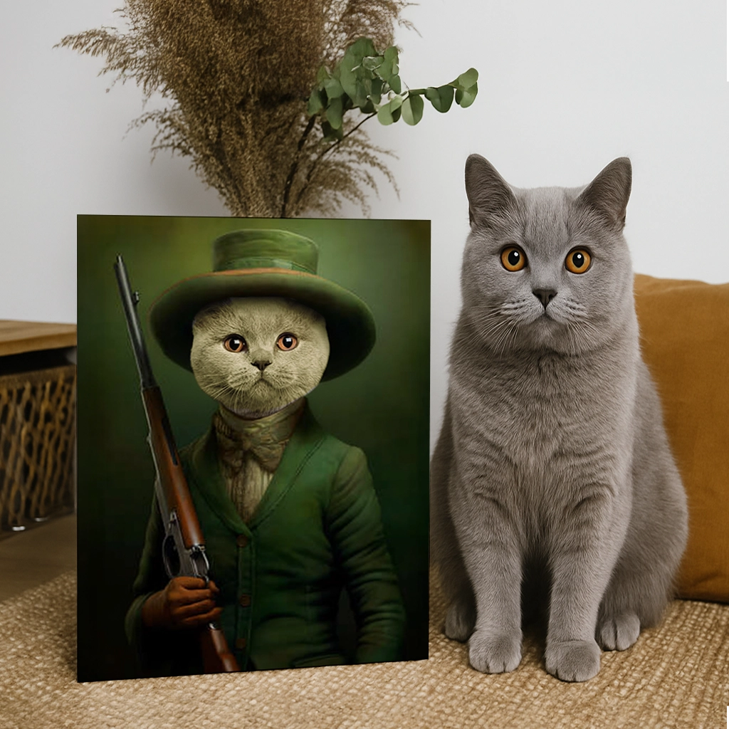 Chaque détail de la veste et de l’arme est traité avec une finesse picturale exceptionnelle, garantissant que votre Portrait British Shorthair Chasseur soit une œuvre d’art digne d’un musée. Il est un hommage à la fois à votre Chat et à l’élégance intemporelle des portraits d’époque.