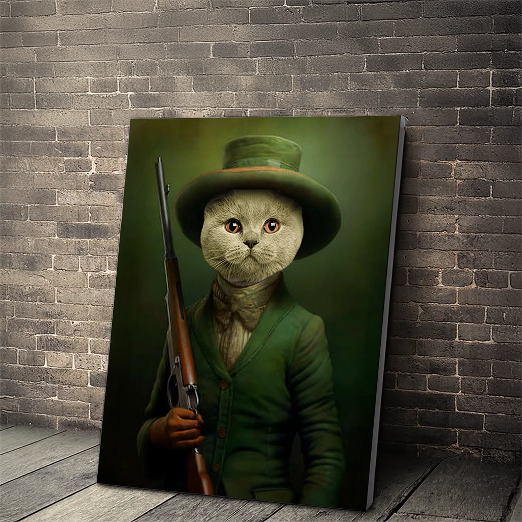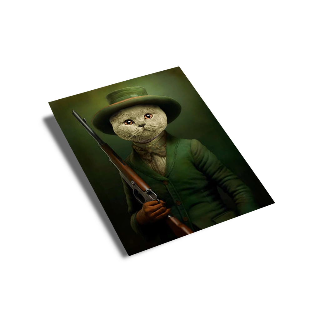 Le Portrait British Shorthair Chasseur est une œuvre d’art qui respire l’élégance et la tradition britannique. Ce tableau capture la dignité naturelle de votre British Shorthair en le transposant dans un costume de chasse classique du XIXe siècle. Votre Chat est vêtu d’une veste de tweed ou de laine vert forêt, coiffé d’un chapeau feutré assorti, et porte une cravate lâche beige, le tout avec un air de concentration et de noblesse. Il tient fièrement un fusil de chasse à l’épaule, symbolisant l’adresse et le respect des traditions de la *cynégétique*.