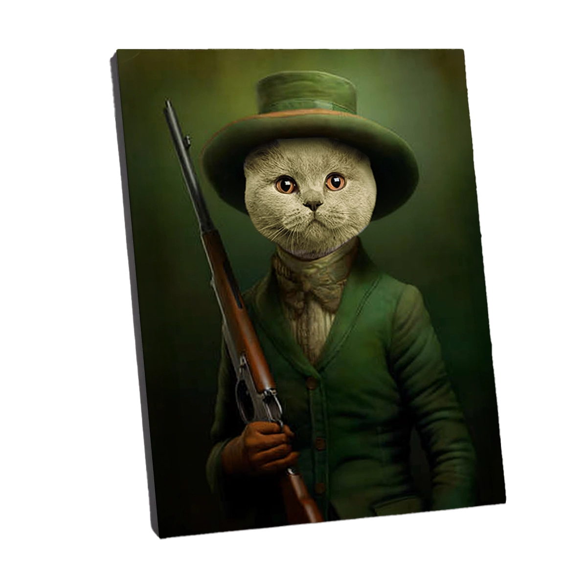 Le fond est caractérisé par un vert riche et sombre, créant une ambiance feutrée et mystérieuse, typique des portraits de gentilshommes. Ce style s’intègre parfaitement dans un intérieur de style *country*, un bureau lambrissé ou un salon classique, ajoutant une touche d’histoire et de caractère. L’association de la fourrure dense et du regard ambre du British Shorthair avec le vert du costume est visuellement très réussie, conférant au Portrait British Shorthair Chasseur une présence magnétique. La chasse est un thème majeur dans la Chasse dans l’Art et la Culture, et ce tableau honore cette tradition picturale.