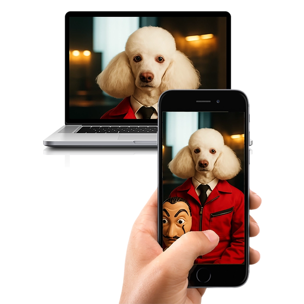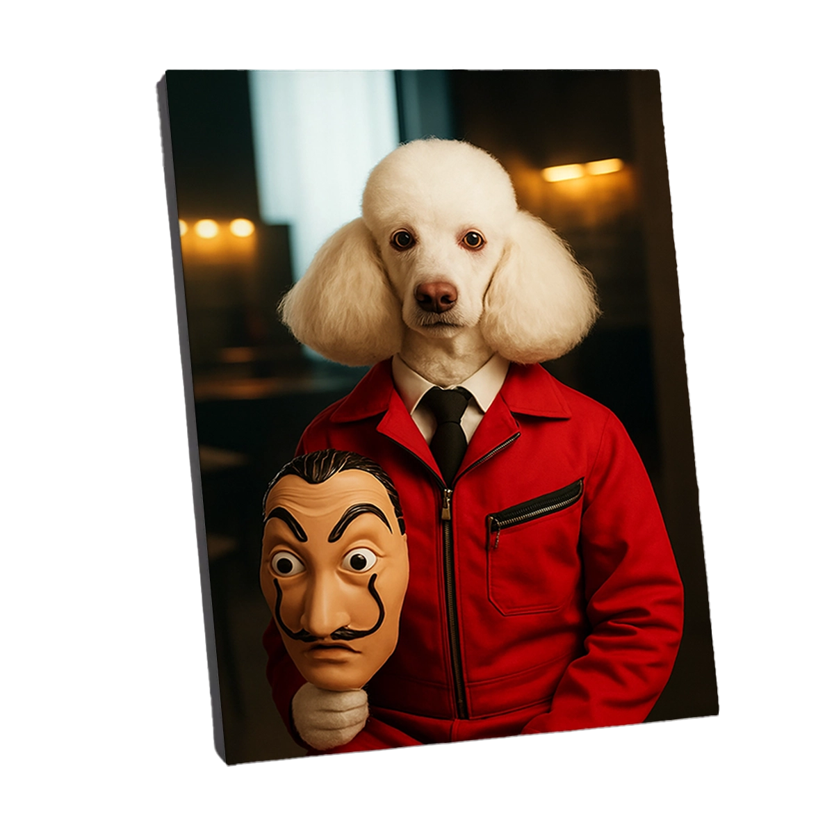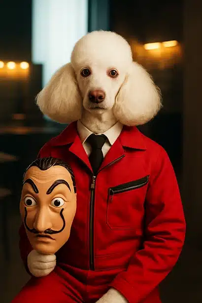 Ce portrait est une pièce de conversation garantie. Il marie l’élégance naturelle du Caniche à l’imagerie populaire forte de l’action et du suspense. Chaque Portrait Caniche Braqueur est un symbole de solidarité face aux institutions. La couleur rouge vif du costume contraste puissamment avec le fond sombre et la fourrure blanche du chien, assurant un impact visuel maximal. Quant au masque tenu par votre Caniche, son design, inspiré par l’Art Surréaliste et le célèbre artiste catalan, est devenu un symbole mondial de rébellion, que vous pouvez découvrir ici : Salvador Dalí.