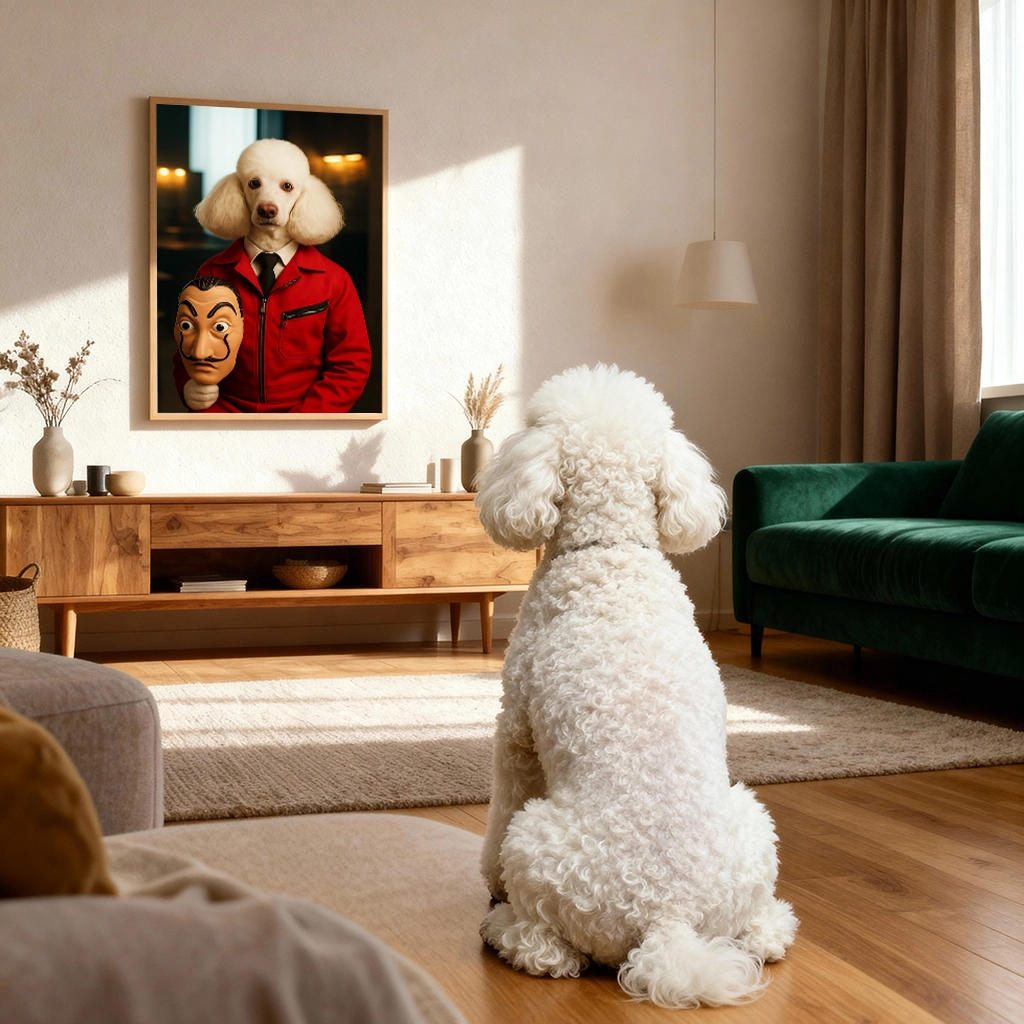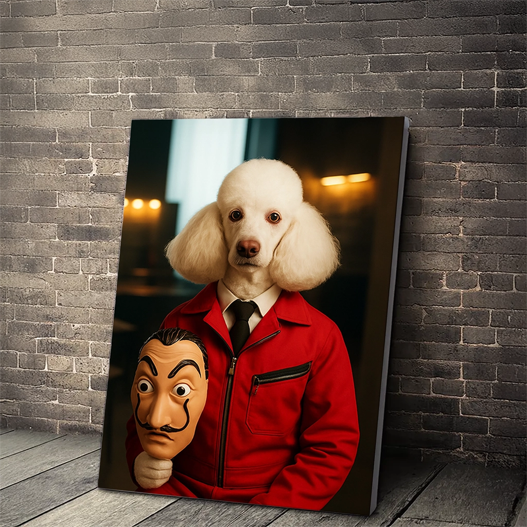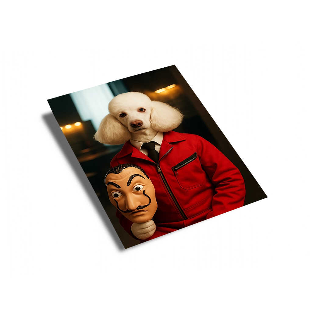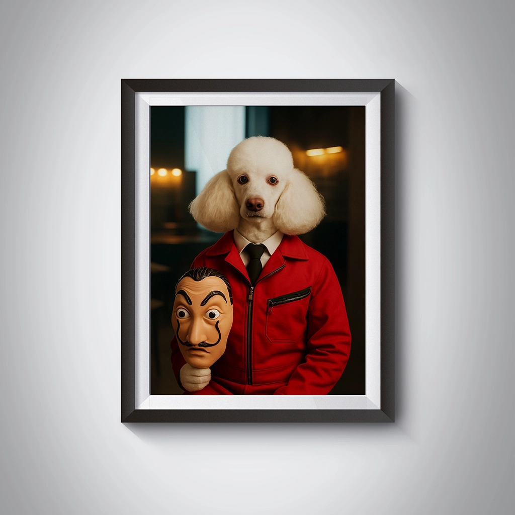 Capturez l’esprit de rébellion et d’unité avec notre audacieux Portrait Caniche Braqueur. Cette œuvre d’art rend hommage aux récits cinématographiques de résistance et d’opérations audacieuses. Votre Caniche, avec sa fourrure immaculée, est revêtu de la fameuse combinaison rouge emblématique, et tient à la main un masque au style marquant. L’ambiance est tendue, le regard de votre chien est sérieux, suggérant une intelligence tactique et une détermination sans faille, dignes du cerveau d’une opération. Ce tableau est destiné à ceux qui admirent les récits de génie criminel et de défi à l’autorité.