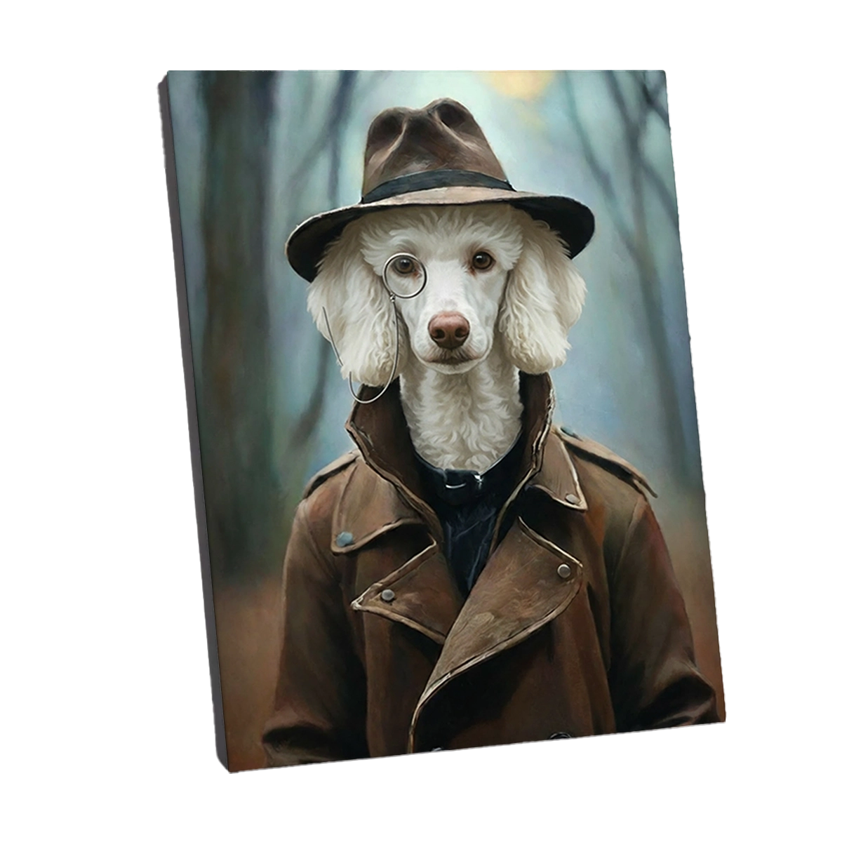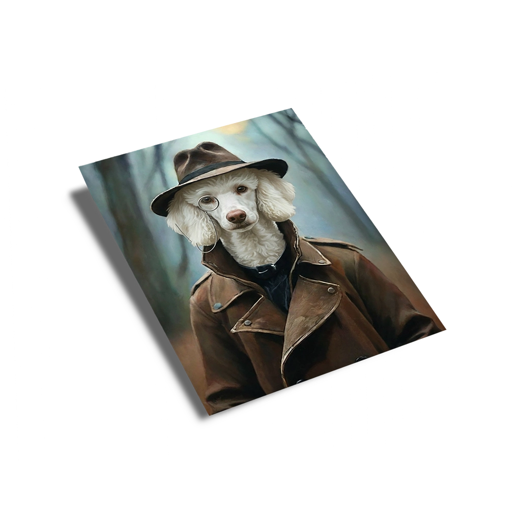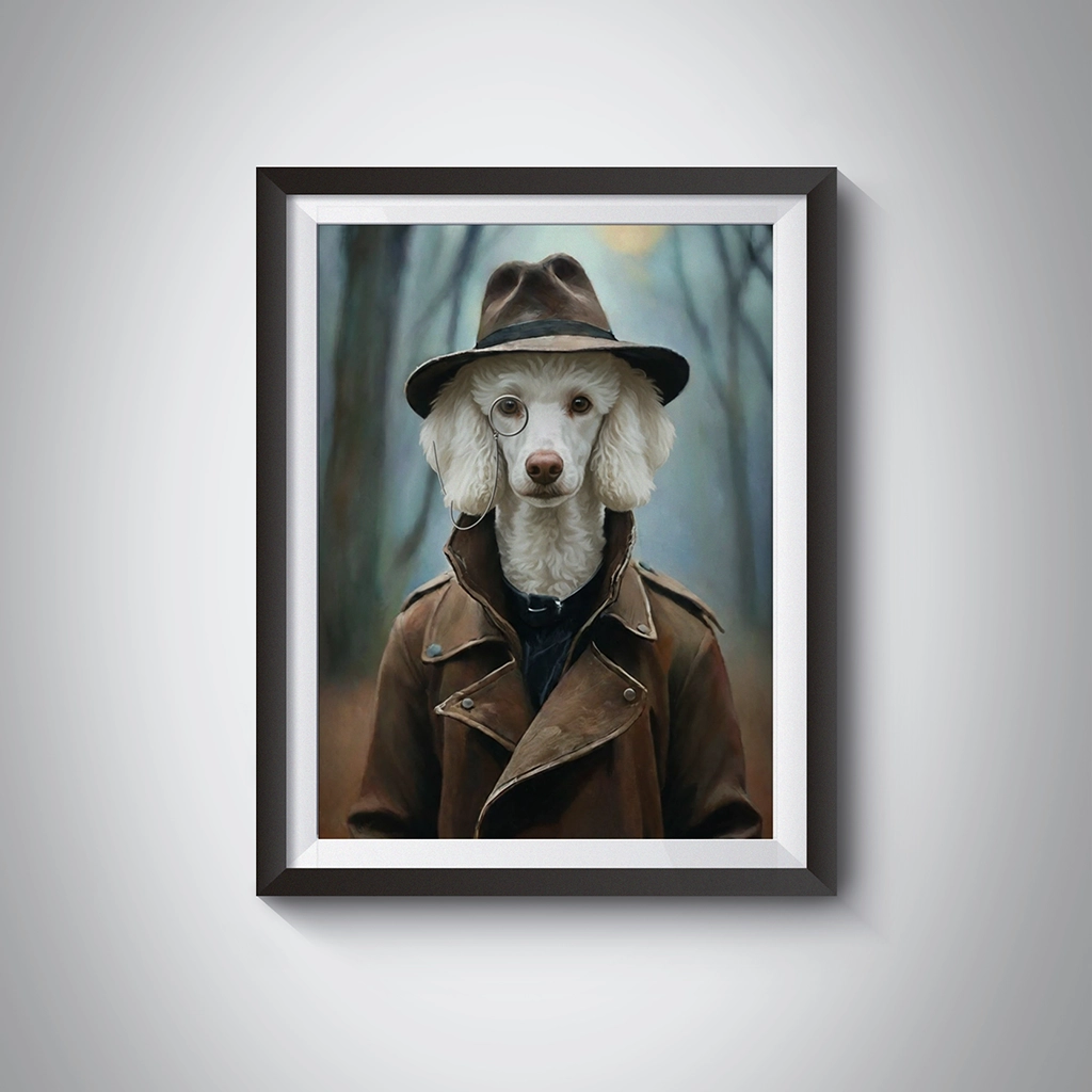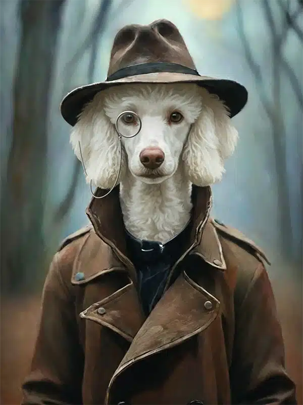 Plongez dans l’univers brumeux des années 1940 avec notre fascinant Portrait Caniche Old School. Cette œuvre d’art est une incarnation du mystère et de la sophistication, transformant votre Caniche au poil blanc immaculé en un détective privé ou un espion de l’époque, arborant un trench-coat classique, un fédora sombre et un monocle distingué. Le décor, une forêt embrumée aux couleurs douces et automnales, accentue le côté mystérieux et l’ambiance des films d’enquête d’antan. Ce portrait est une véritable capsule temporelle pour votre mur.