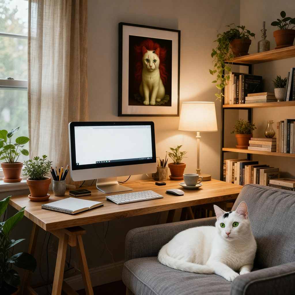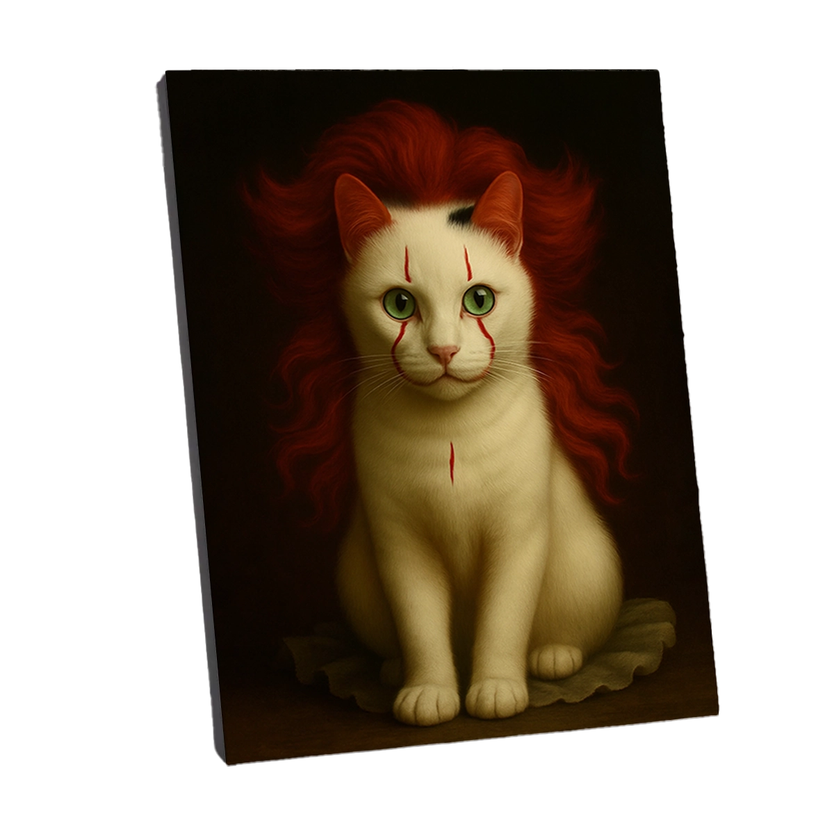 Notre collection « Pop Culture Obscure » célèbre les personnages qui marquent l’imaginaire collectif. Le Portrait Chat Clown est le choix parfait si vous voulez que votre décoration ait du caractère et ne ressemble à aucune autre. C’est l’hommage idéal à l’ambiguïté des clowns dans la culture contemporaine. Le contraste des yeux verts vifs du Chat sur le fond sombre et le rouge du maquillage confère une dimension presque surnaturelle à l’œuvre.