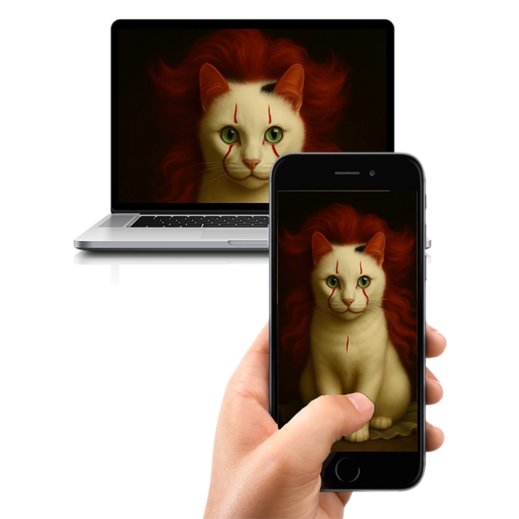 La création de votre Portrait Chat Clown est un travail d’équilibriste. L’artiste doit intégrer la perruque rousse et le col de la tenue pour qu’ils semblent naturels. Le traitement des yeux verts est intensifié pour qu’ils soient le point focal de l’horreur. Un soin particulier est apporté au maquillage pour qu’il soit à la fois effrayant et réaliste sur la fourrure blanche.