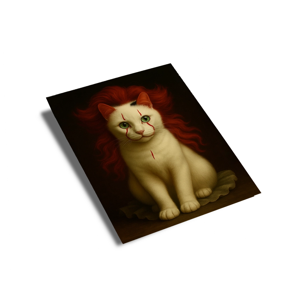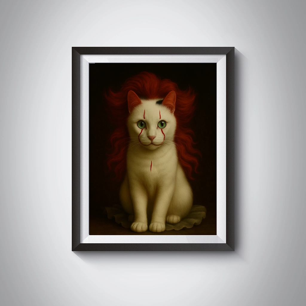 Plongez dans l’ambiance des contes les plus sombres avec notre saisissant Portrait Chat Clown. Cette œuvre d’art rend hommage aux personnages de fiction qui incarnent nos peurs ancestrales. Votre Chat, avec son pelage blanc contrastant, arbore fièrement une chevelure rouge flamboyante et le maquillage caractéristique des clowns sinistres (lignes de larmes rouges, expression figée). Le fond noir profond, traité en clair-obscur, confère une atmosphère lourde et mystérieuse, digne des plus grands films du genre.