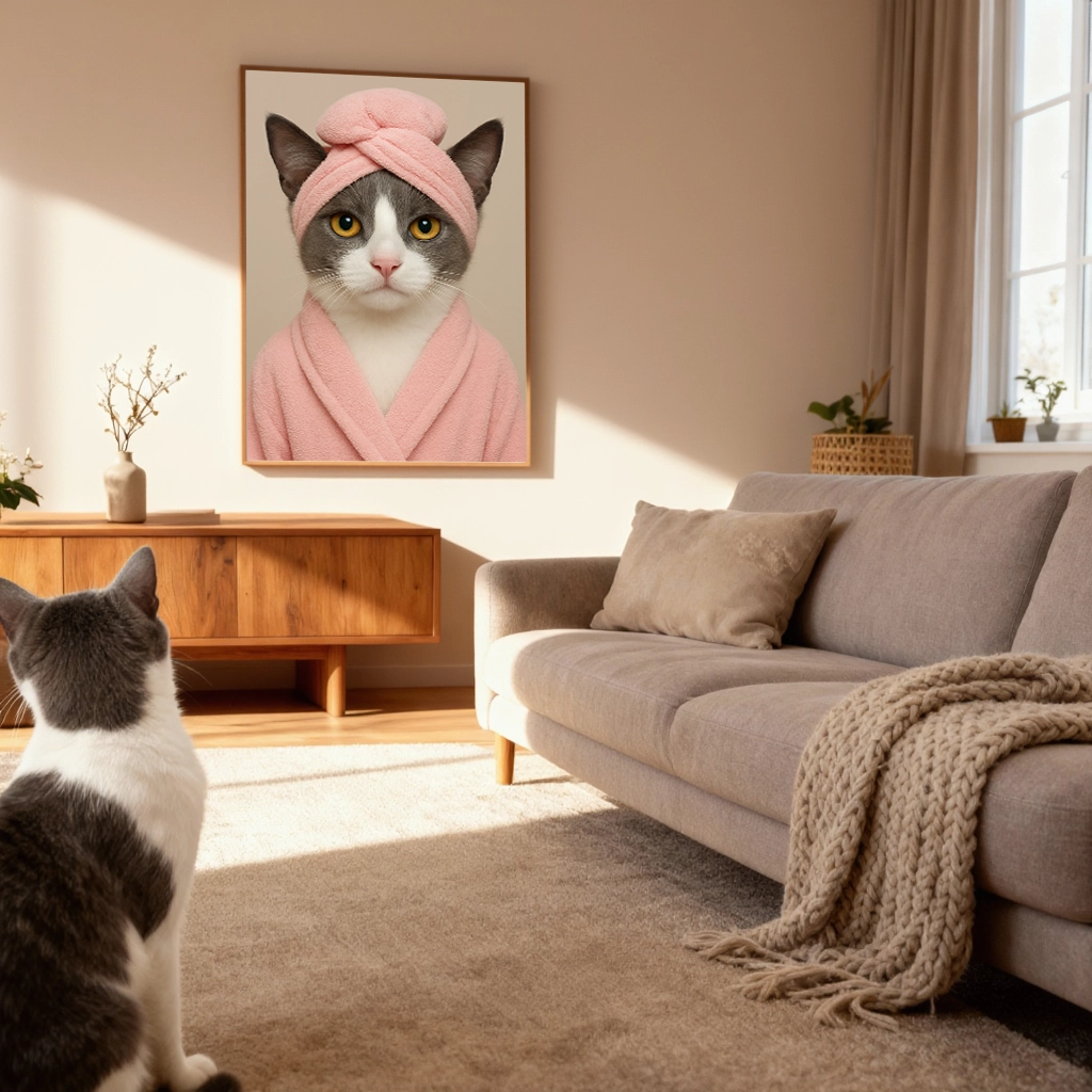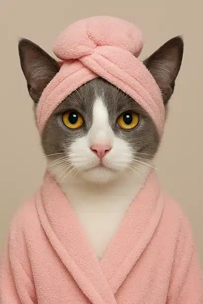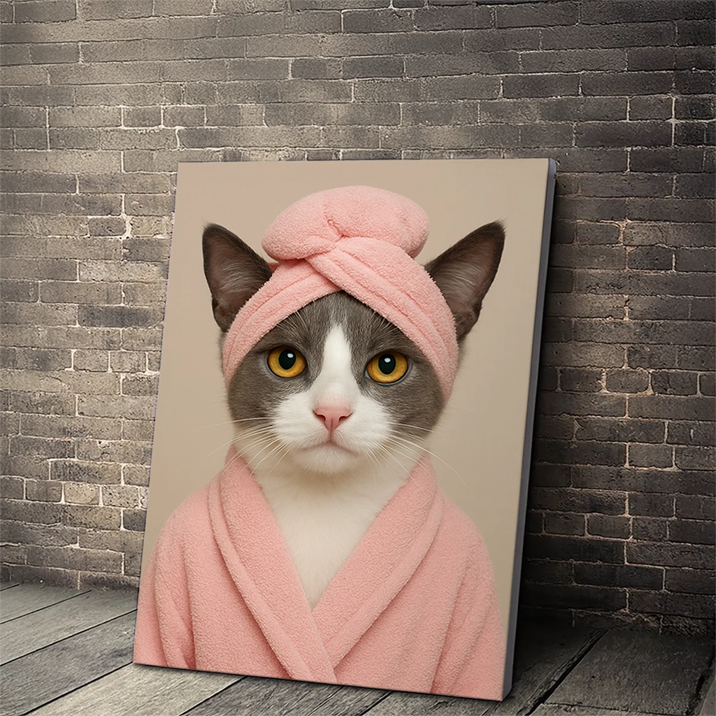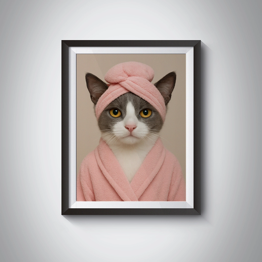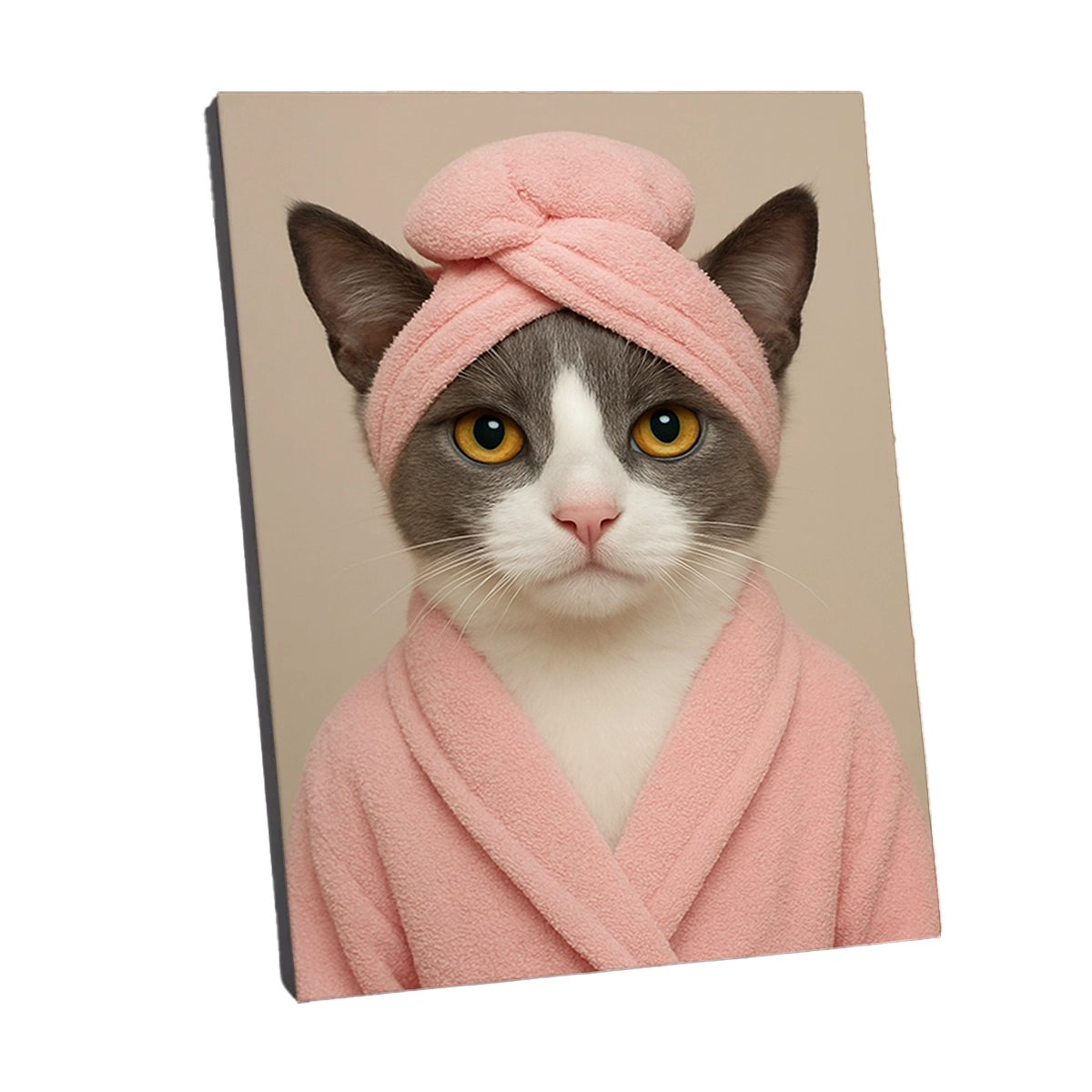 Le Portrait Chat Gris Spa est une œuvre d’art qui célèbre les moments de pure détente et de douceur. Votre Chat, avec son pelage gris et blanc soyeux et ses grands yeux ambre, est transformé en un maître de la relaxation, enveloppé dans un peignoir moelleux rose pastel et coiffé d’un turban assorti. L’ambiance générale est claire, douce et apaisante, rappelant le calme des instituts de luxe. Ce tableau est une invitation constante à ralentir, à profiter du confort et à adopter un art de vivre zen.