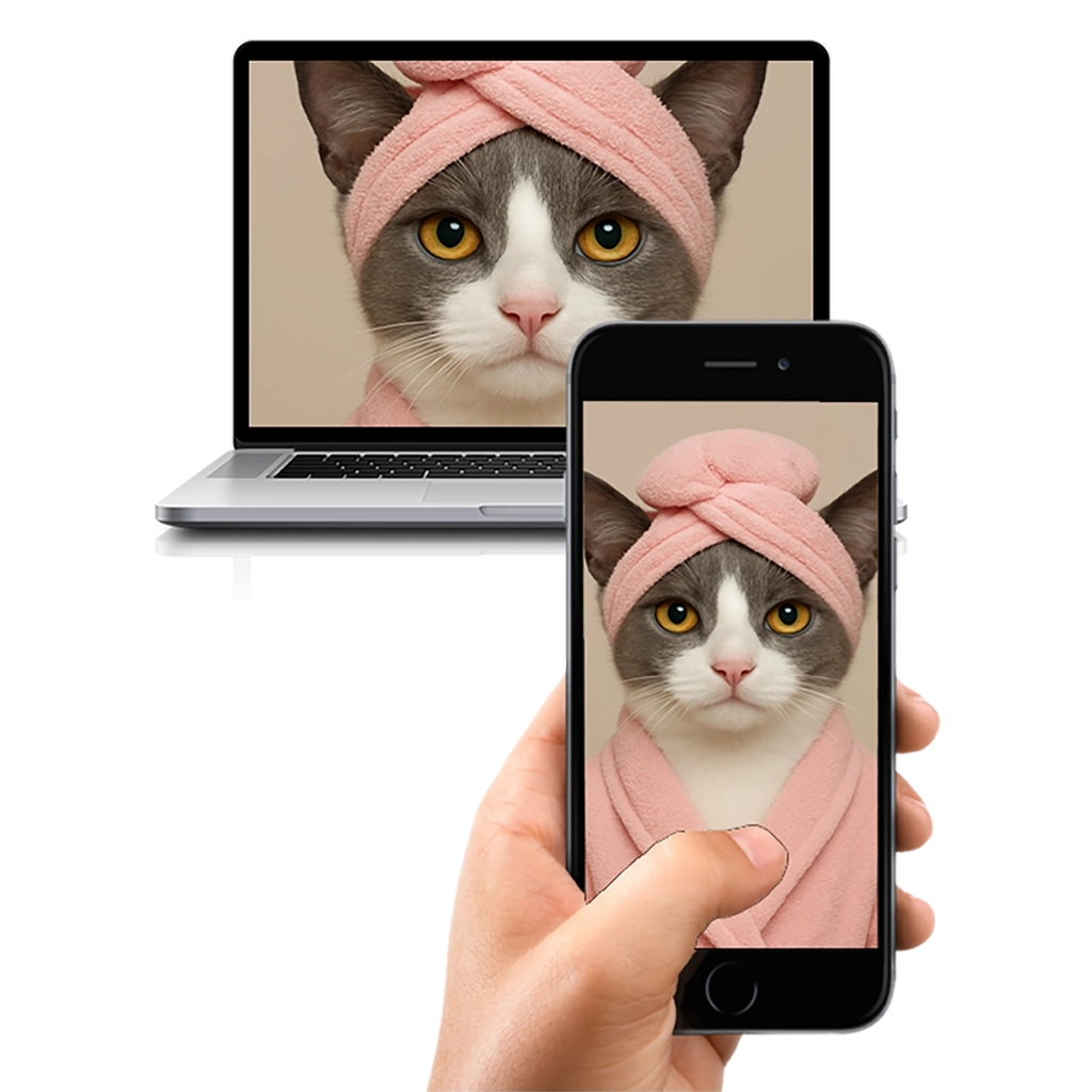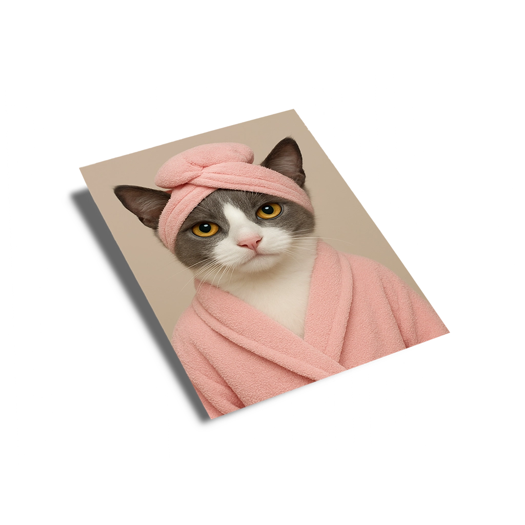 - Personnalisation : Intégration réaliste de la tête de votre Chat, avec ajustement des plis du turban et des ombres douces du peignoir.