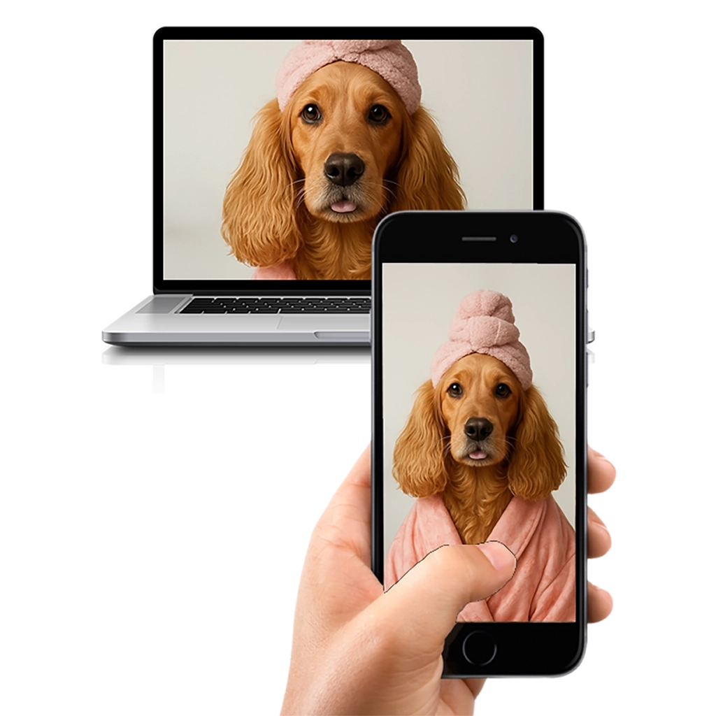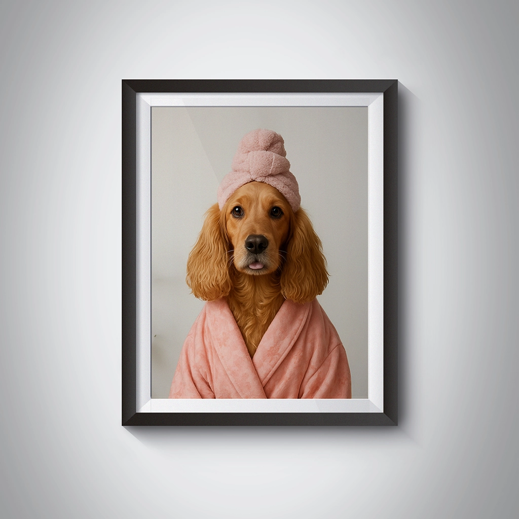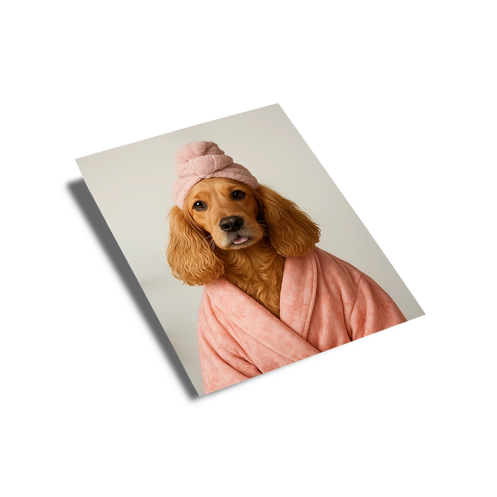 - Personnalisation : Intégration réaliste de la tête de votre Cocker, avec ajustement des plis du turban et des ombres douces du peignoir.