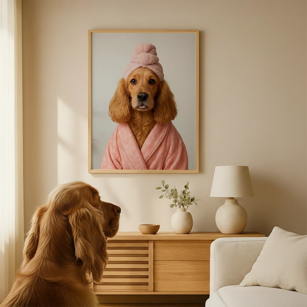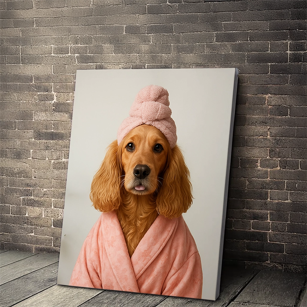 La réussite de ce portrait repose sur le réalisme des textures. Nous garantissons une impression qui reproduit la richesse du tissu éponge du peignoir et du turban sans que les teintes roses ne soient ternes. L’impression est optimisée pour que le pelage doré du Cocker conserve sa chaleur naturelle. Votre Portrait Cocker Spa est conçu pour conserver sa douceur et son charme pour les années à venir.