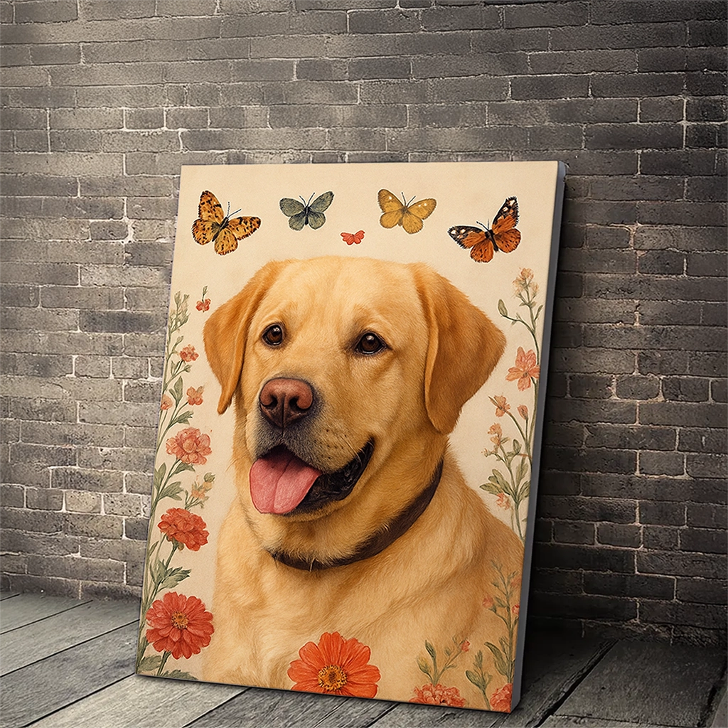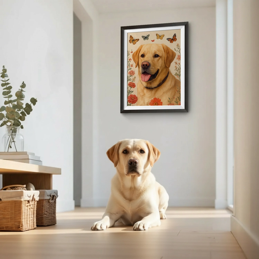 Avec ses tons clairs, ses accents de rouge corail et ses touches de jaune papillon, ce portrait s’accorde merveilleusement avec des intérieurs de style Shabby Chic, bohème ou classique revisité. C’est le cadeau idéal pour un amoureux de la nature, un passionné de jardinage, ou simplement pour honorer votre Labrador avec une œuvre d’art qui met en valeur sa personnalité solaire.