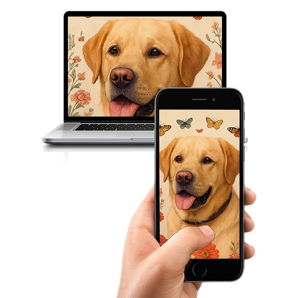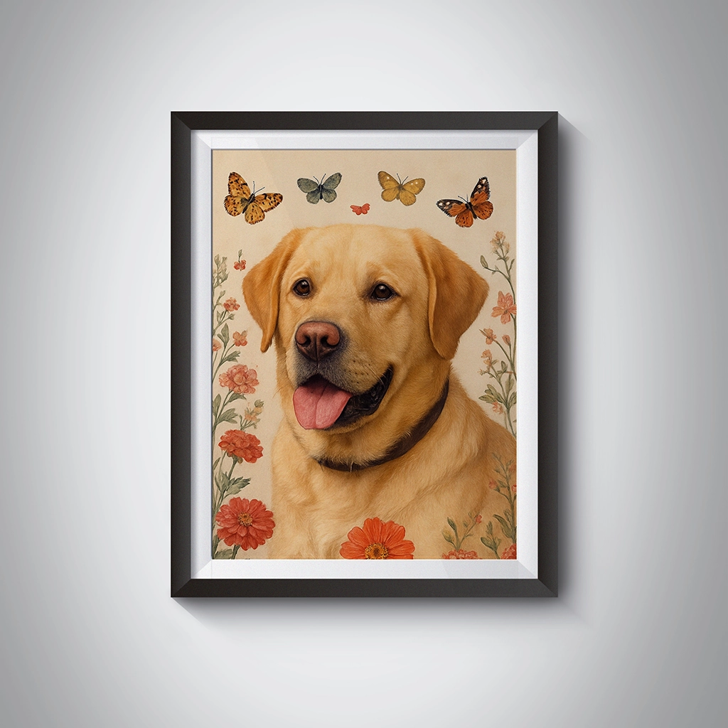 La création de votre Portrait Labrador Fleurs nécessite une intégration soignée pour que l’animal ne soit pas masqué par les motifs. Nous veillons à ce que les fleurs et les papillons encadrent la tête de votre chien sans la distraire. L’artiste travaille spécifiquement la lumière pour que les reflets doux du fond se posent sur le pelage de votre Labrador, donnant l’illusion qu’il a été photographié dans un jardin de rêve.