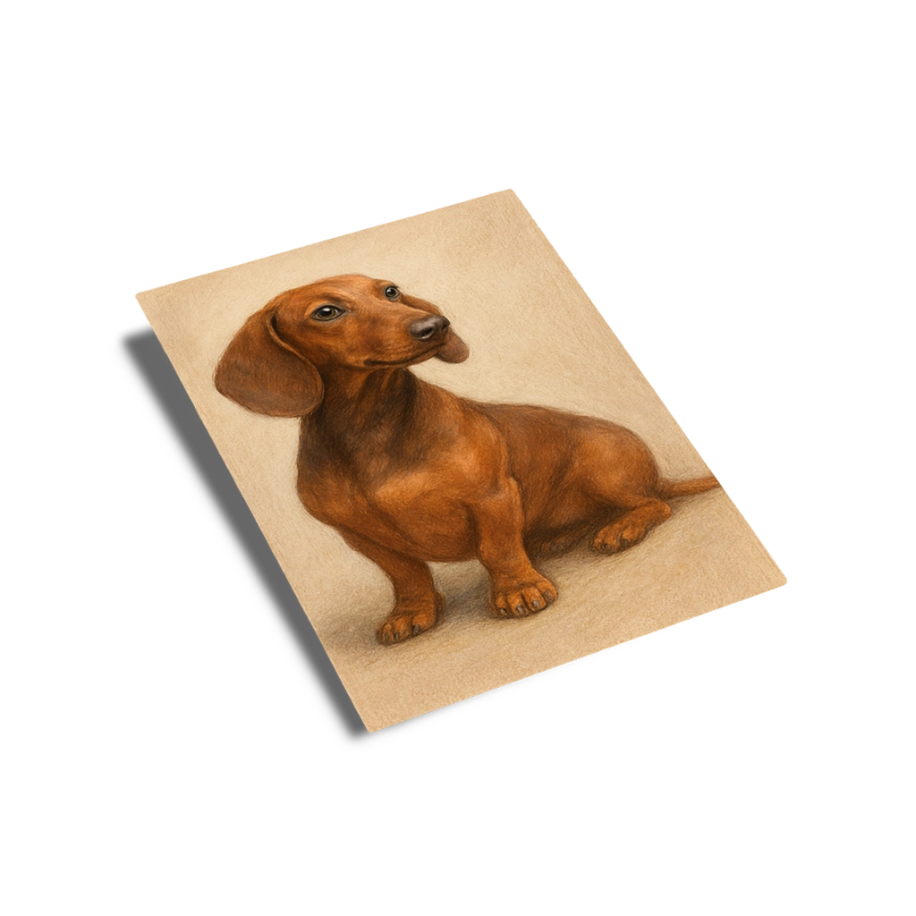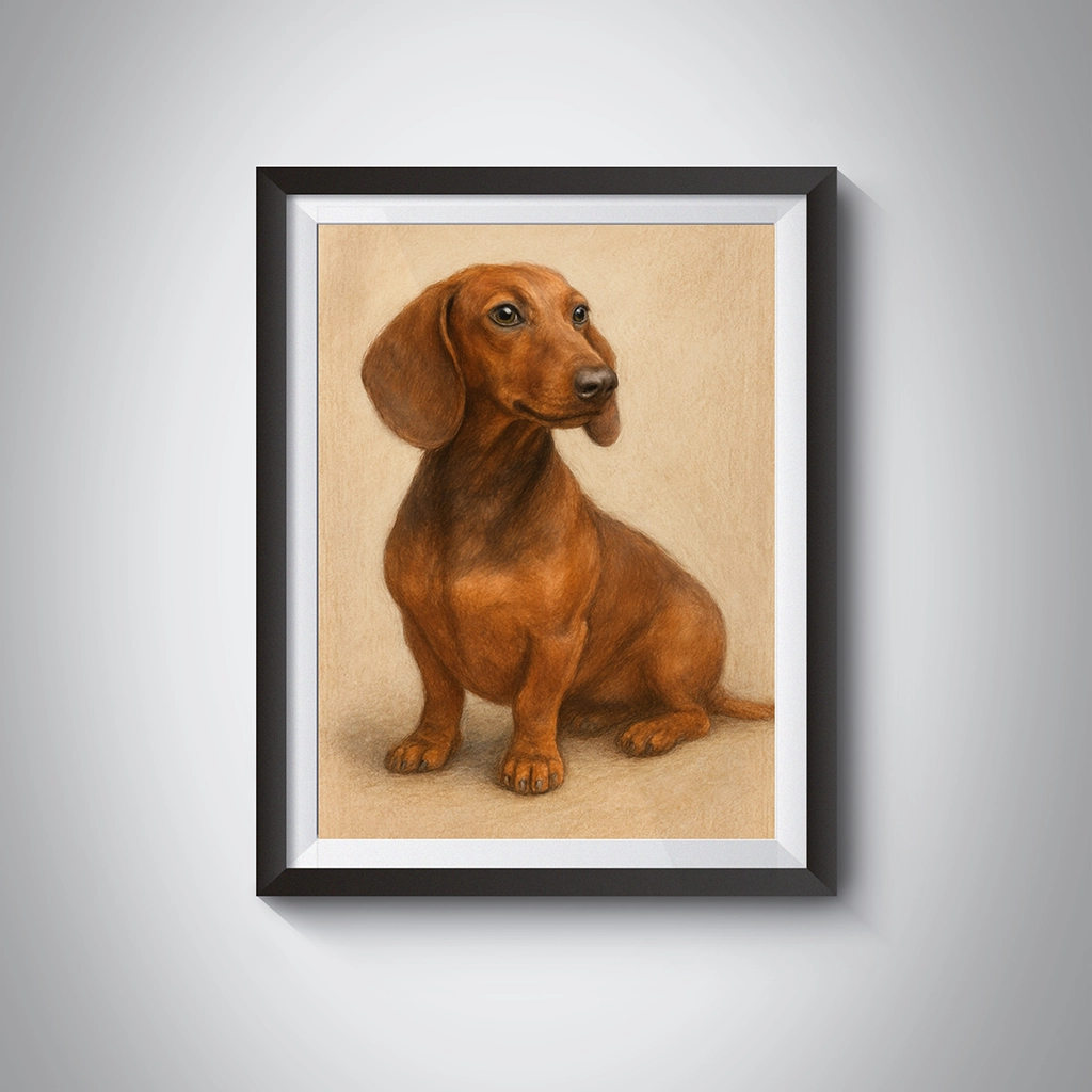 - Personnalisation : Traitement artistique de la photo de votre Teckel pour simuler l’application du pastel et de la craie, avec un accent sur le soyeux des oreilles.