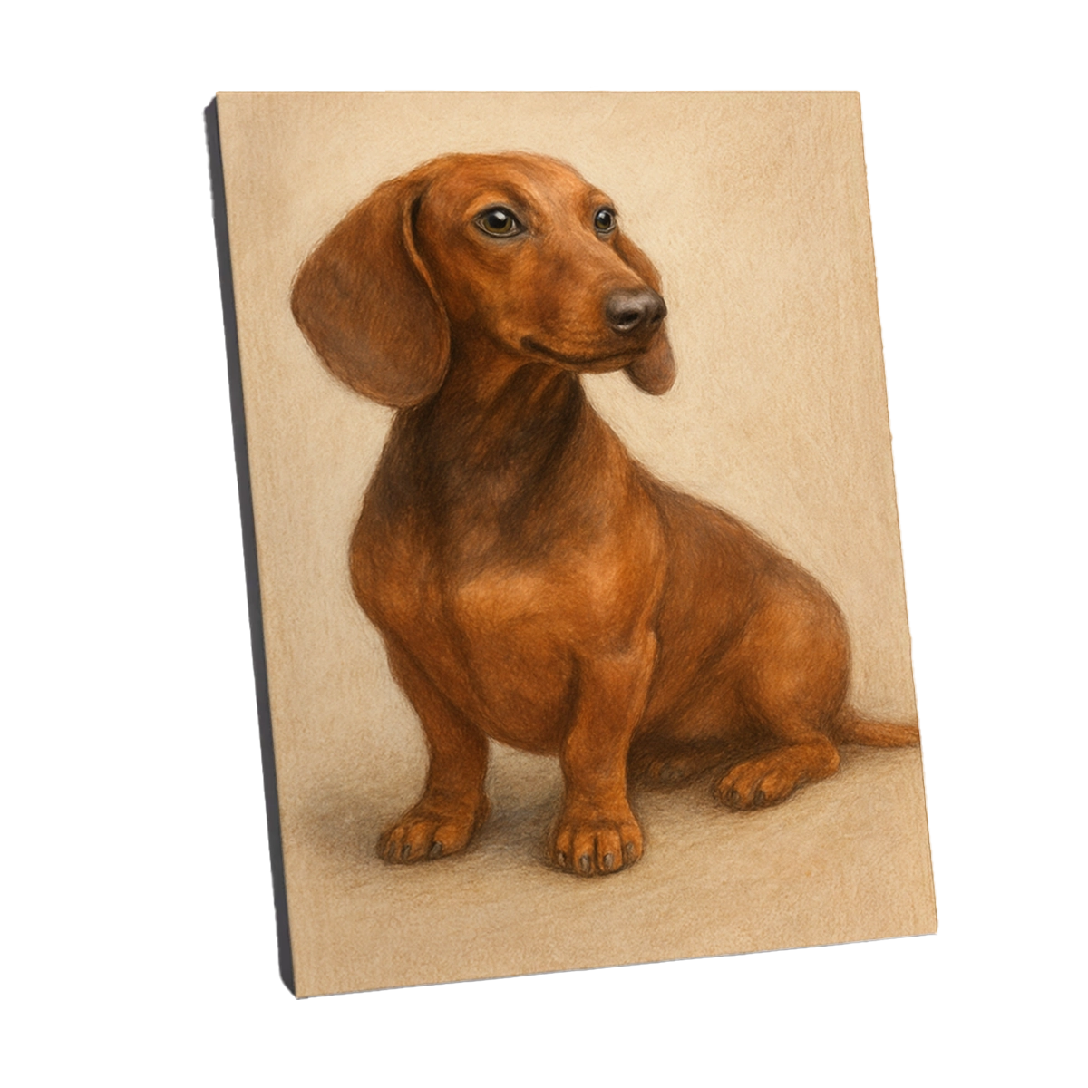 Le Portrait Teckel Pastel est une œuvre d’art d’une tendresse et d’une finesse exceptionnelles. Inspiré par l’élégance classique des dessins au pastel, ce tableau capture votre Teckel dans une lumière douce, le pelage acajou rendu avec une texture granuleuse et veloutée, caractéristique de cette **technique artistique**. Le fond, souvent un papier texturé dans les tons beiges ou ocre, renforce l’aspect artisanal et intime du dessin. Ce style est parfait pour ceux qui recherchent un portrait qui semble avoir été réalisé à la main par un artiste animalier, il y a plusieurs décennies.